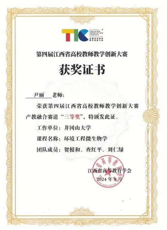 近日,我院参赛教师尹丽主讲的《环境工程微生物学》获第四届江西省高校教师教学创新大赛产教融合赛道三等奖,杜志喧老师在第六届江西省高校青年教师教学竞赛中获理科组三等奖。