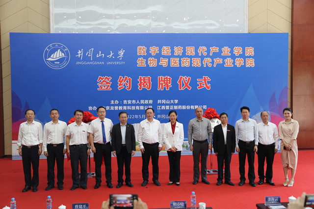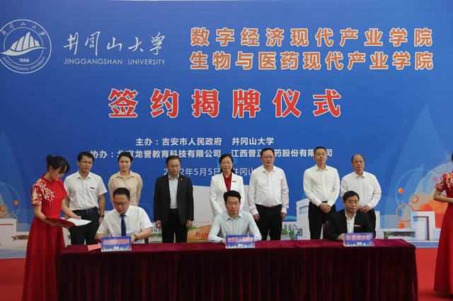 为贯彻国家有关战略要求,落实《国务院办公厅关于深化产教融合的若干意见》(国办发〔2017〕95号)、《教育部 工业和信息化部 现代产业学院建设指南(试行)》(教高厅函〔2020〕16号)以及《江西省普通本科高校现代产业学院建设实施方案》(赣教高字〔2021〕23号)等文件精神,促进教育链、人才链与产业链、创新链有机衔接,井冈山大学整合学校相关专业和学科优势,主动对接江西省“2+6+N”重点产业和吉安市“1+4+N”产业体系,聚焦吉安市重点产业生物医药企业需求,2022年5月5日,联合吉安市人民政府、江西普正制药股份有限公司签署《井冈山大学 吉安市工信局 江西普正制药股份有限公司共建井冈山大学生物与医药现代产业学院合作协议》,共建全市首批产教融合现代产业学院,致力培养生物与医药产业高素质创新应用型人才培养。