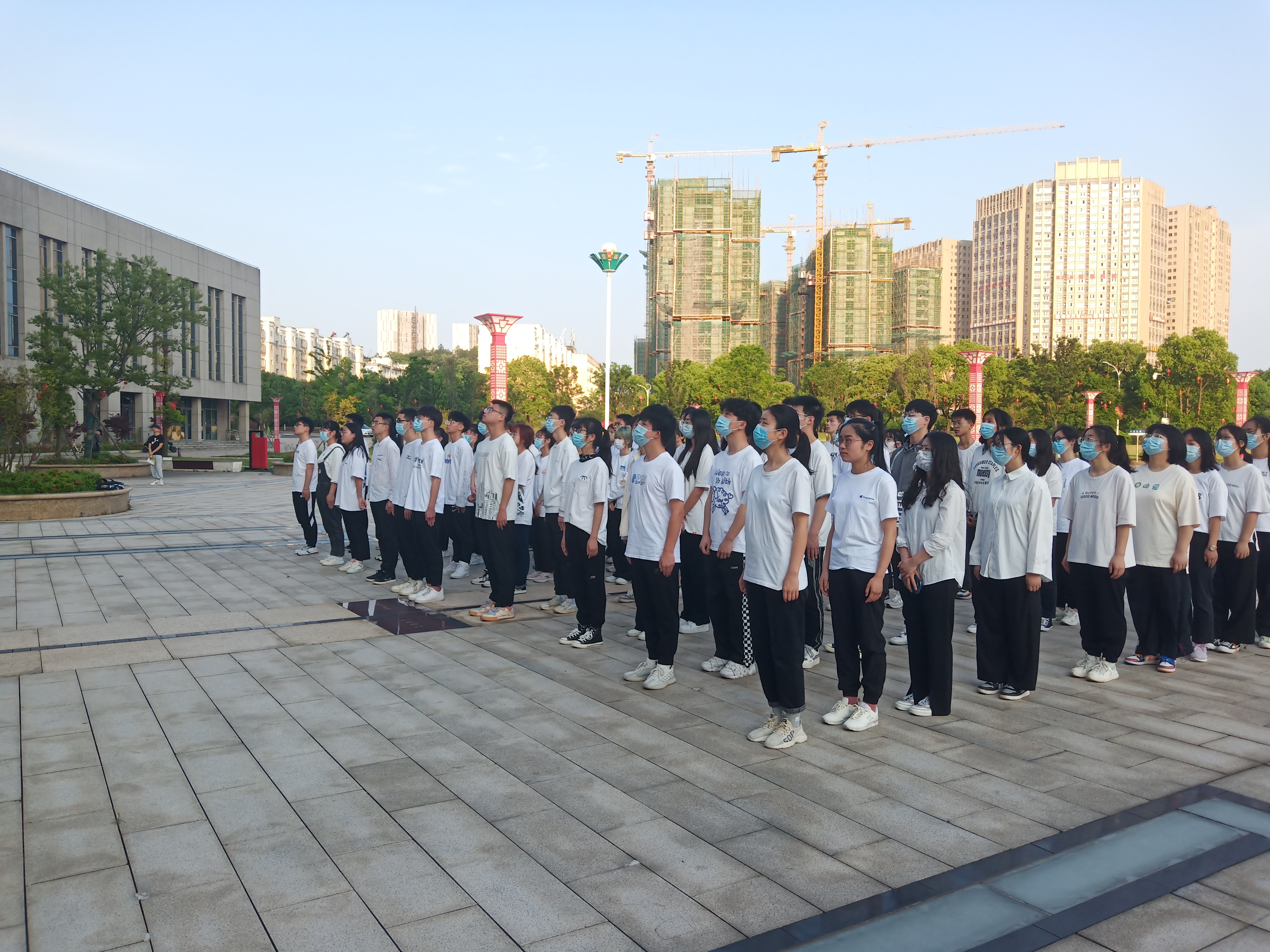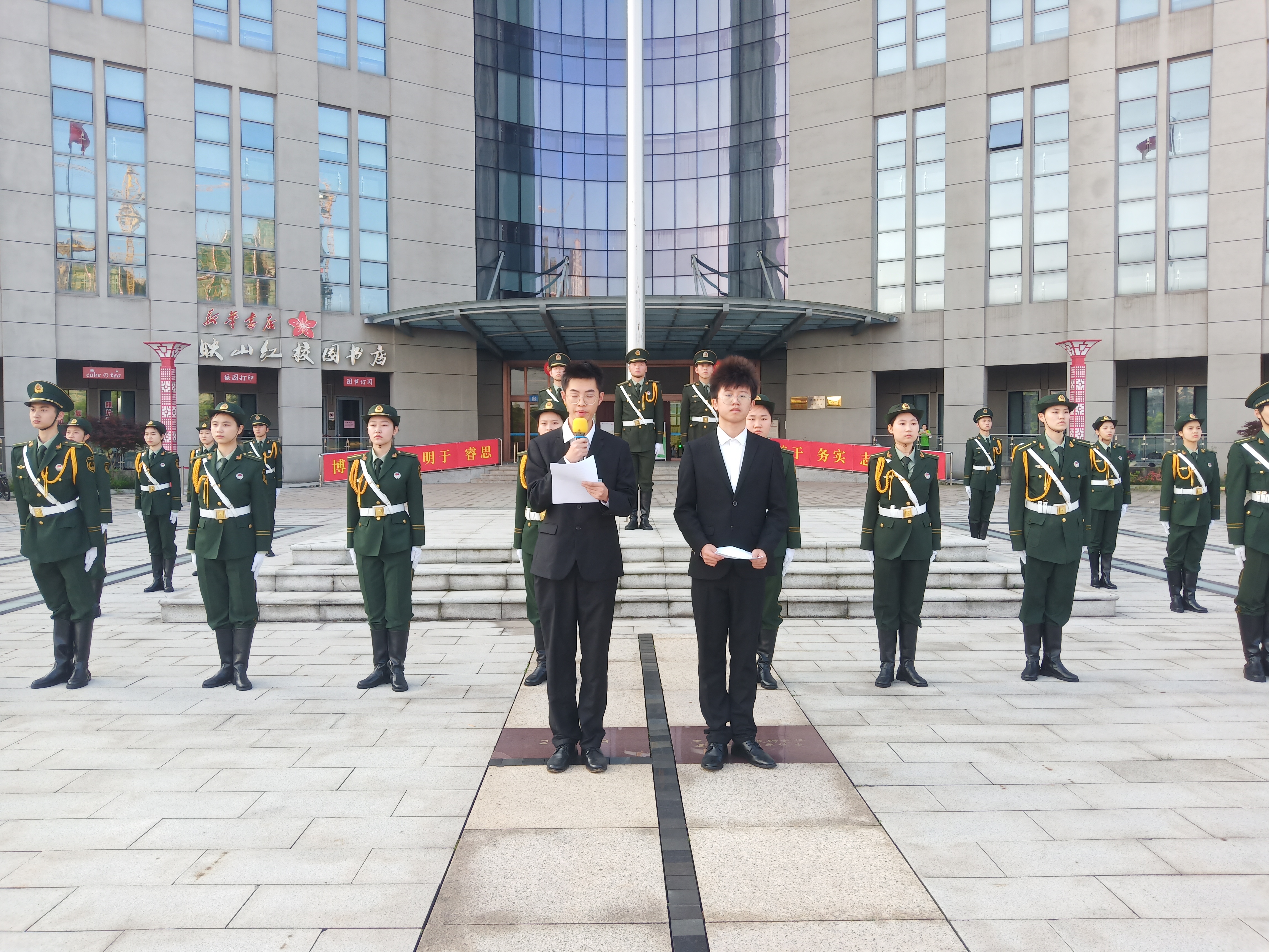为了勉励同学们在疫情期间不忘初心,努力拼搏,我校于4月25日早晨在新图书馆映山红广场国旗台前隆重举行本学期第十周升旗仪式。本次升旗仪式由我院裴梓俊主持、王天刺主讲,我校国旗护卫队和21级新生代表共计100余人参加。