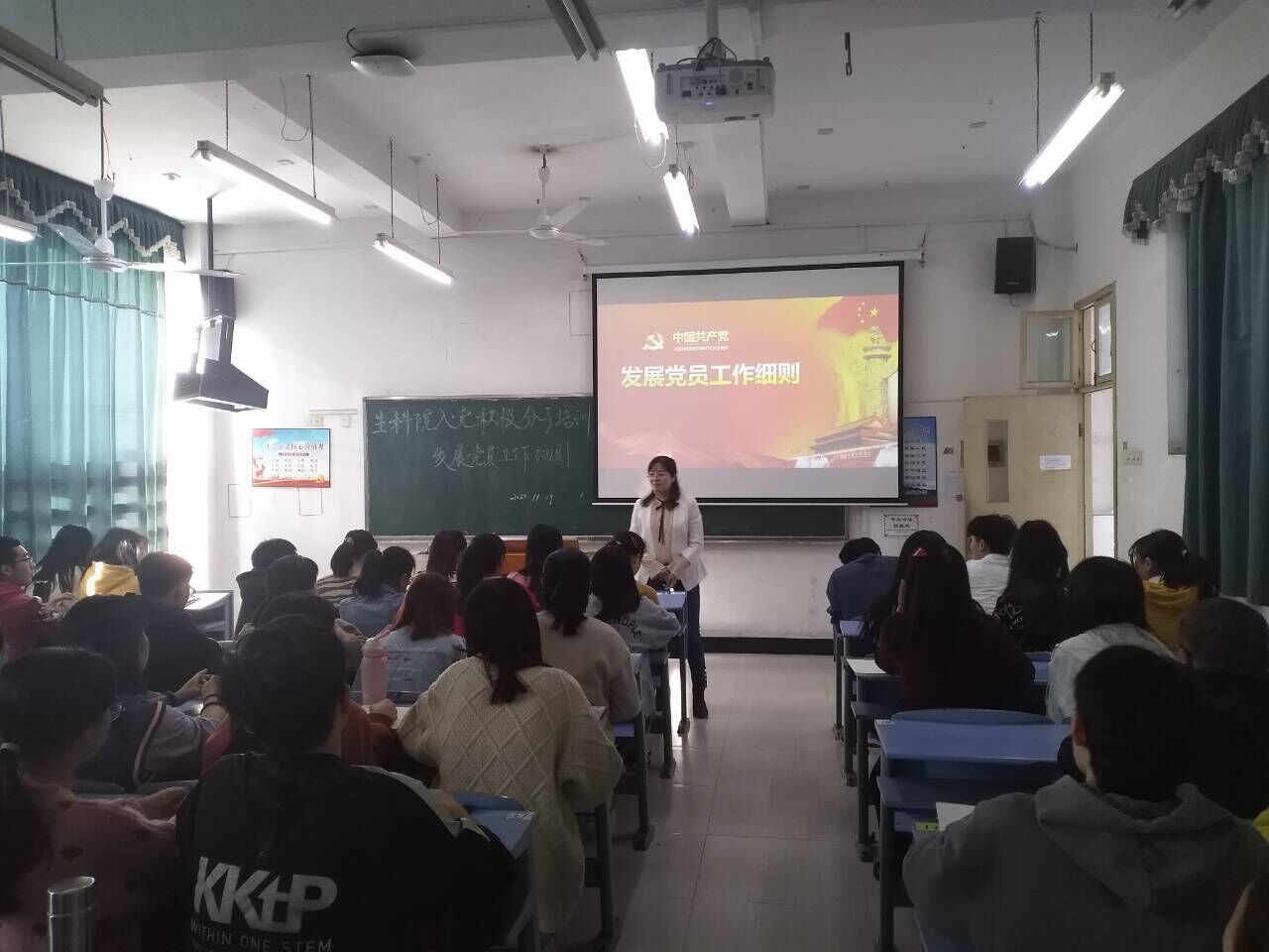 11月9日上午,生命科学学院入党积极分子培训于9栋201教室举行,学生党支部书记给同学们上了一堂题为发展党员工作细则”的专题党课,全体生科院入党积极分子培训班成员参会。