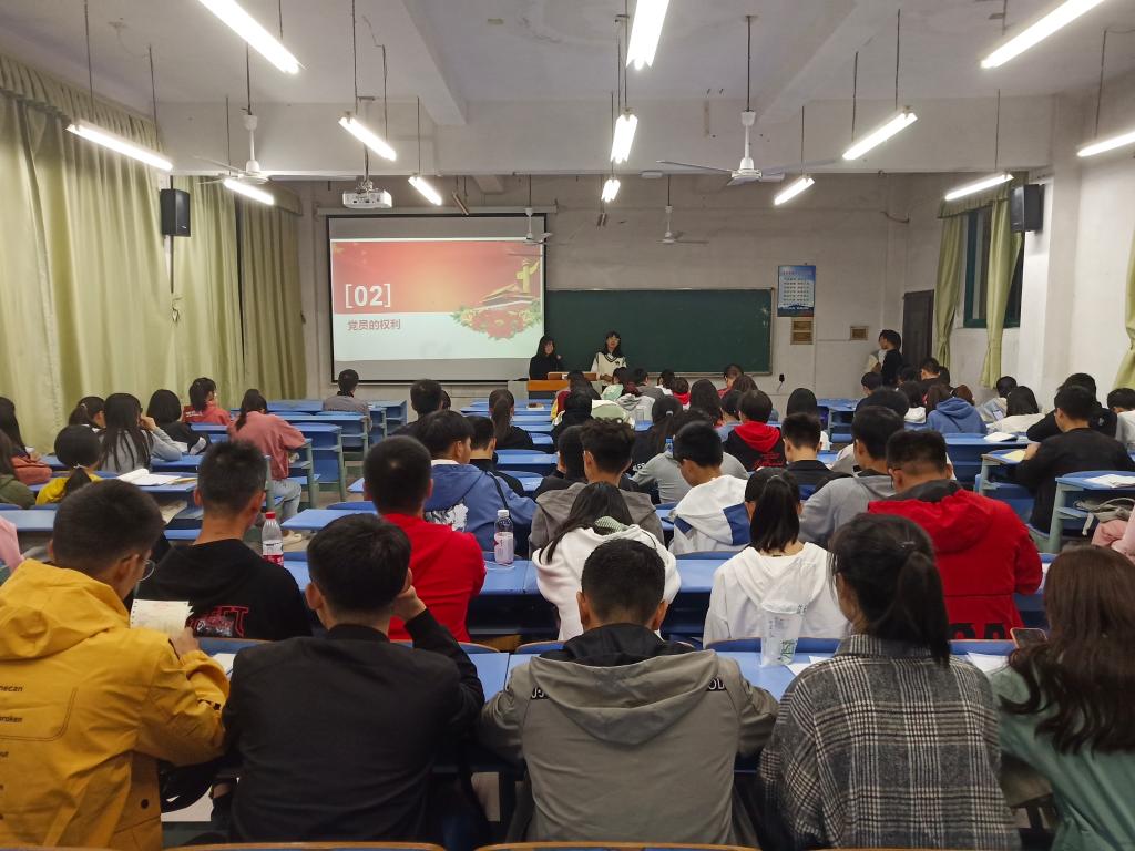 在106教室,张欢详细地介绍了中国共产党的由来,以及党的权利和义务,并号召在场人员向党组织靠拢、向党看齐。在405教室,黄义倩和舒怡为大家讲述了一个合格党员的核心要素和习近平总书记对新时代合格党员的要求。在501教室,刘洁和黄琳和现场参与人员积极互动,先询问大家是否想成为一个党员,再问他们对党的认知和入党动机,现场人员积极参与,各自表述了自己的想法。