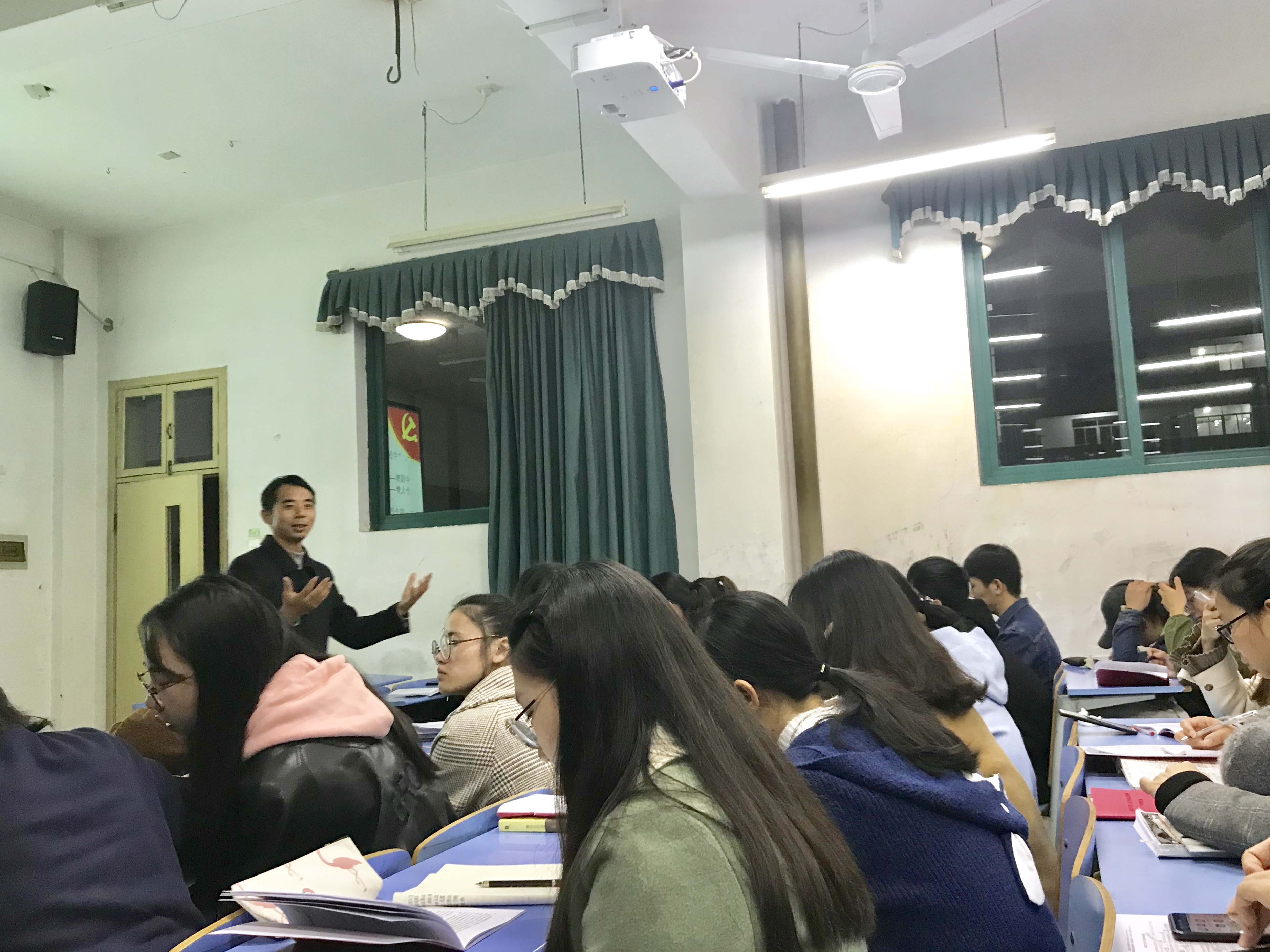 讲座伊始,朱焕明老师从当前党员发展形势谈及入党从严、注重质量的必要性和重要性。然后讲述了党的核心领导作用与中国梦和个人梦之间关系,并对十九大提出的“四个伟大”的内容和相互关系进行了解读,深化了大家对加强党的建设的重要性的认识。接着,他重点从端正入党动机的重要性、端正入党动机的基本要求以及如何以实际行动争取早日加入党组织三个方面与大家展开交流。课堂中,朱老师或辅之以诵读,或辅之以高歌,讲课神采飞扬,气氛活跃热烈。