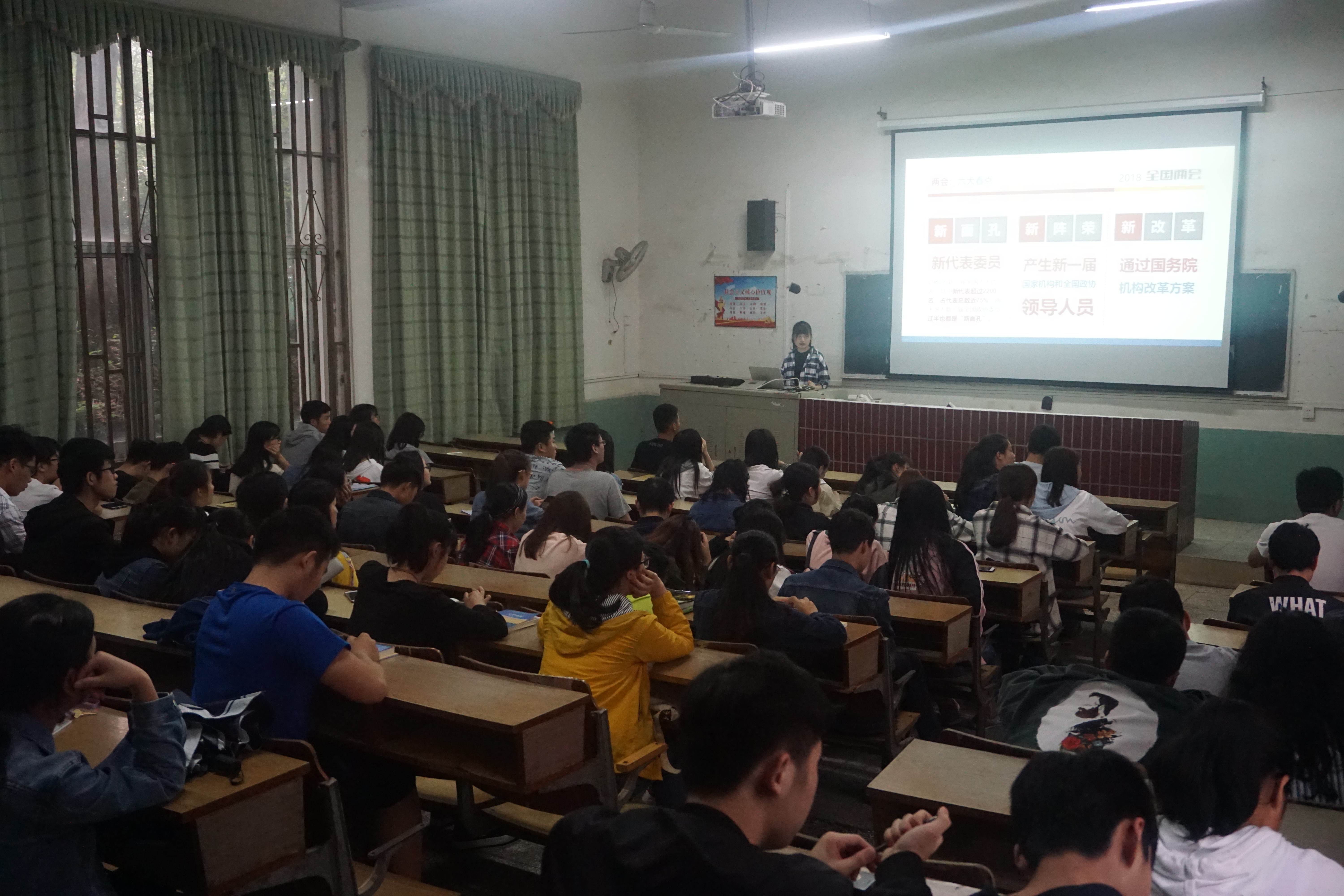 本次活动围绕学习全国两会精神展开,邓烨主要对李克强总理所作的政府工作报告进行讲解,从过去五年的工作回顾、政府工作的建议、民生福利、两会的会议内容等方面进行了分析解读,并且在讲解过程中提出相应的问题让各班同学参与互动,现场气氛热烈。