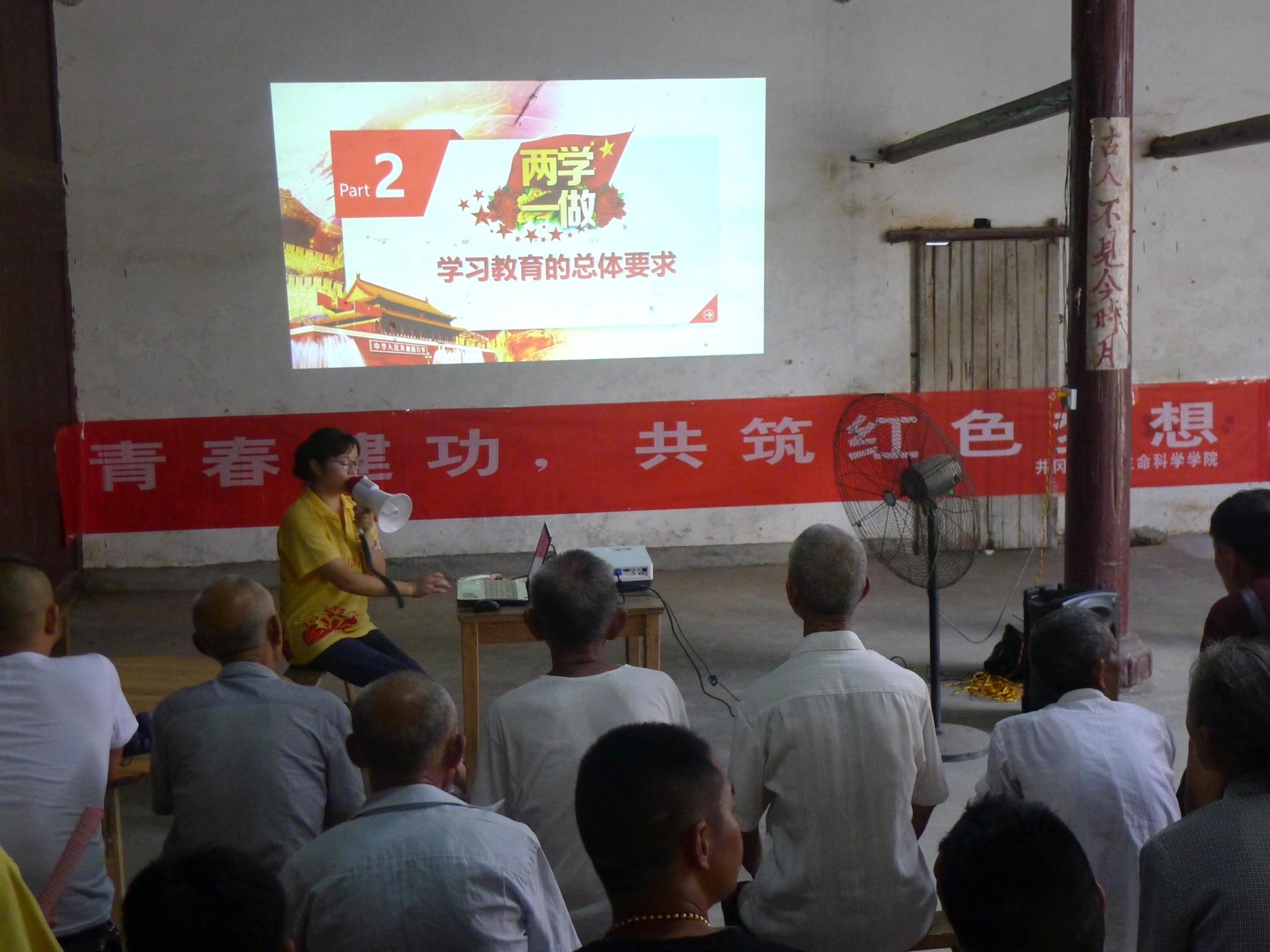 7月9日上午,生命科学学院“携红色同行,建美丽乡村”大学生暑期社会实践团来到吉安市兴桥镇大路村,进行了一场别开生面的党课宣讲活动,学院团委副书记吴丽花老师结合“两学一做”学习教育做讲解。兴桥镇组织委员黄晓安、武装部副部长袁伟出席活动,虎溪村委会主任肖世龙、妇女主任刘五媛和该村15名基层党员一并参加。