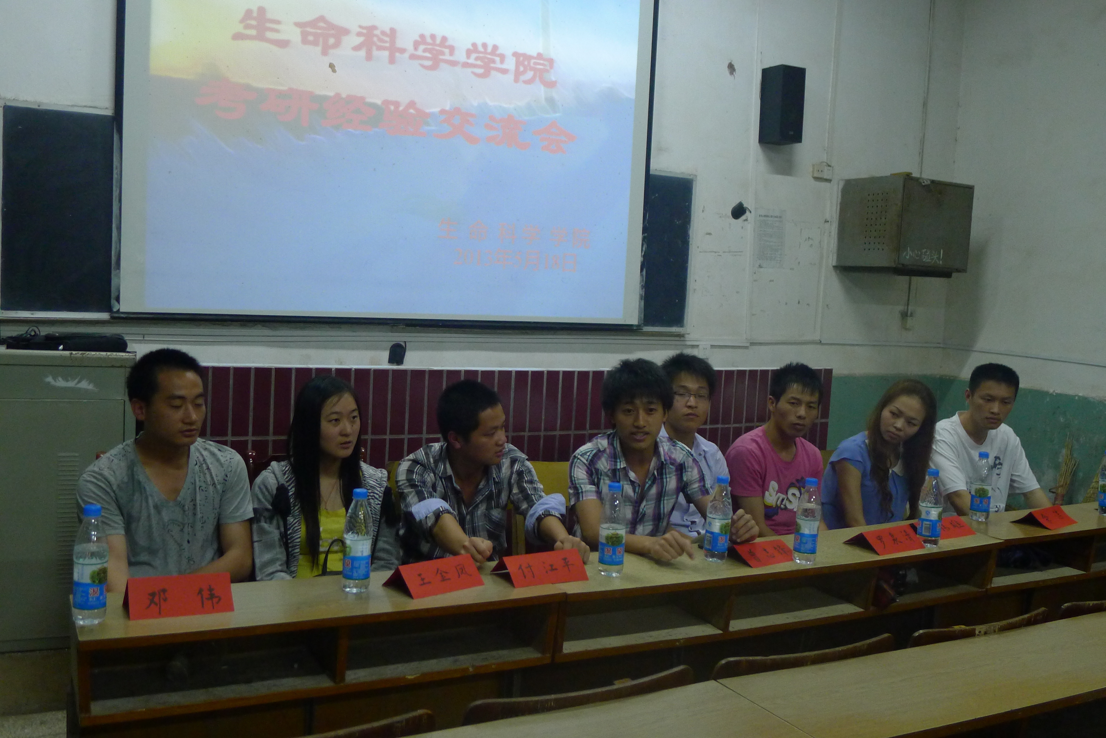 5月19日晚,我院学习部组织举行了考研经验交流会。09级考研成功学子任悍、邓伟、付江平、曾志峰等八位学长应邀与10级准备考研的同学进行现场交流。