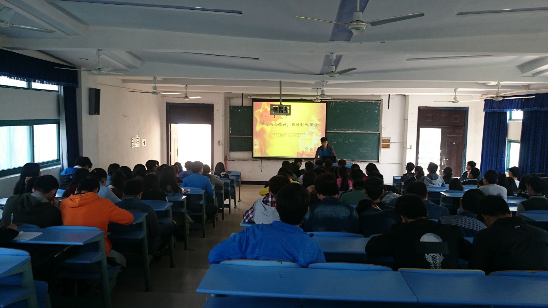 本次团日活动主要以PPT结合讲解的方式向同学们展示了两会的盛况,使同学们详细了解了两会召开的意义、近5年我国基本国情的总体情况以及未来几年国家总体的主要任务。之后,大家还就两会的热点问题进行了热烈讨论。